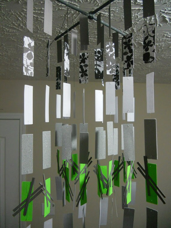 Its true! Kate Mae Designs has given Ashely this modern baby mobile. Colors fading from Slate Gray to white... with a pop of yellow. It will be the perfect fit into Ashley's nursery for her little man. They are adorable over a crib or changing table for baby to look at, or just as a great accent to a bare corner of a room. I will definitley be headed to Kate Mae to have one made for Rozzlyn's room. Pink, Lime, Black, White, Zebra, Damask, Dots, Stripes..... yeah. All of that. The crazier the better for us :) But of course, they're aren't just for baby rooms. They are great in any room to bring a little color out, and add a little visual interest.